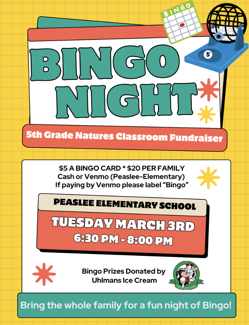 March 3- K-5 Bingo Night at Peaslee - Nature's Classroom/Grade 5 Fundraiser Peaslee School 6:30 PM